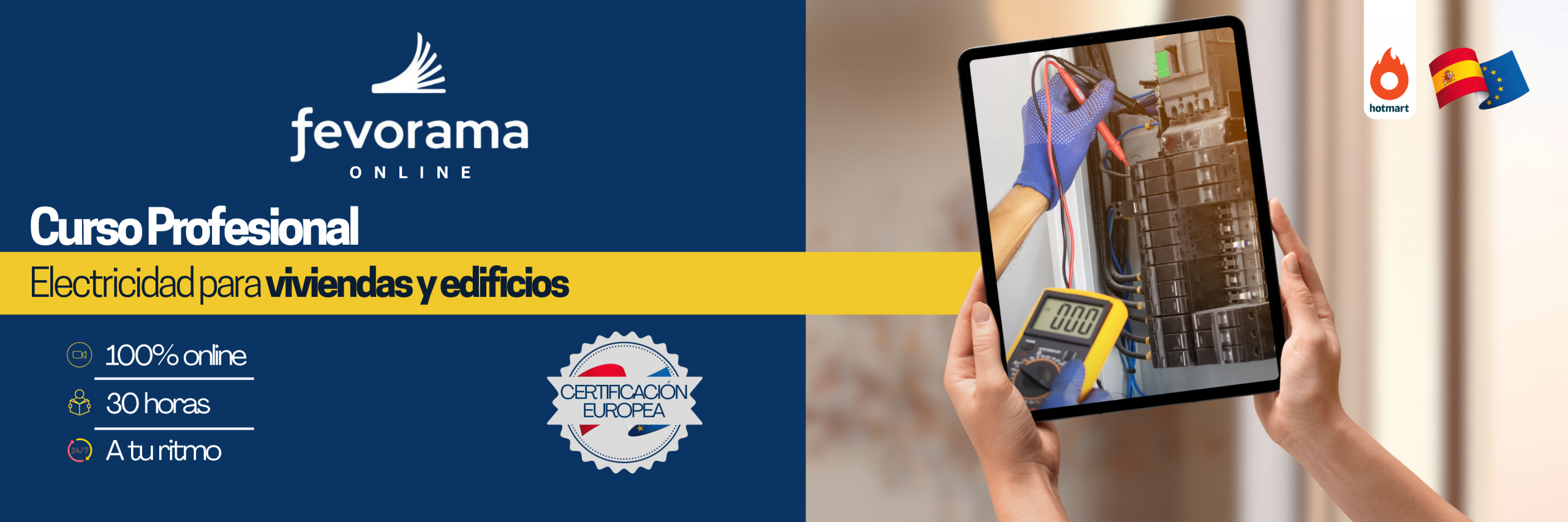 Con esta formación de Fevorama y la plataforma segura de Hotmart, podrás certificarte como Electricista Profesional  y acceder a oportunidades laborales internacionales.